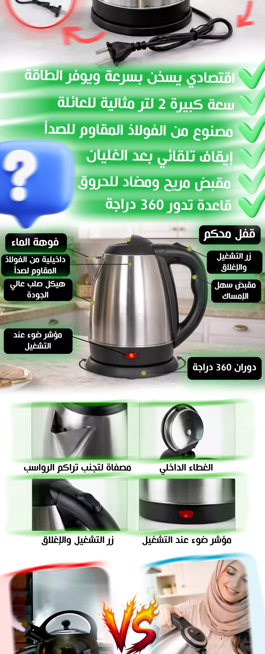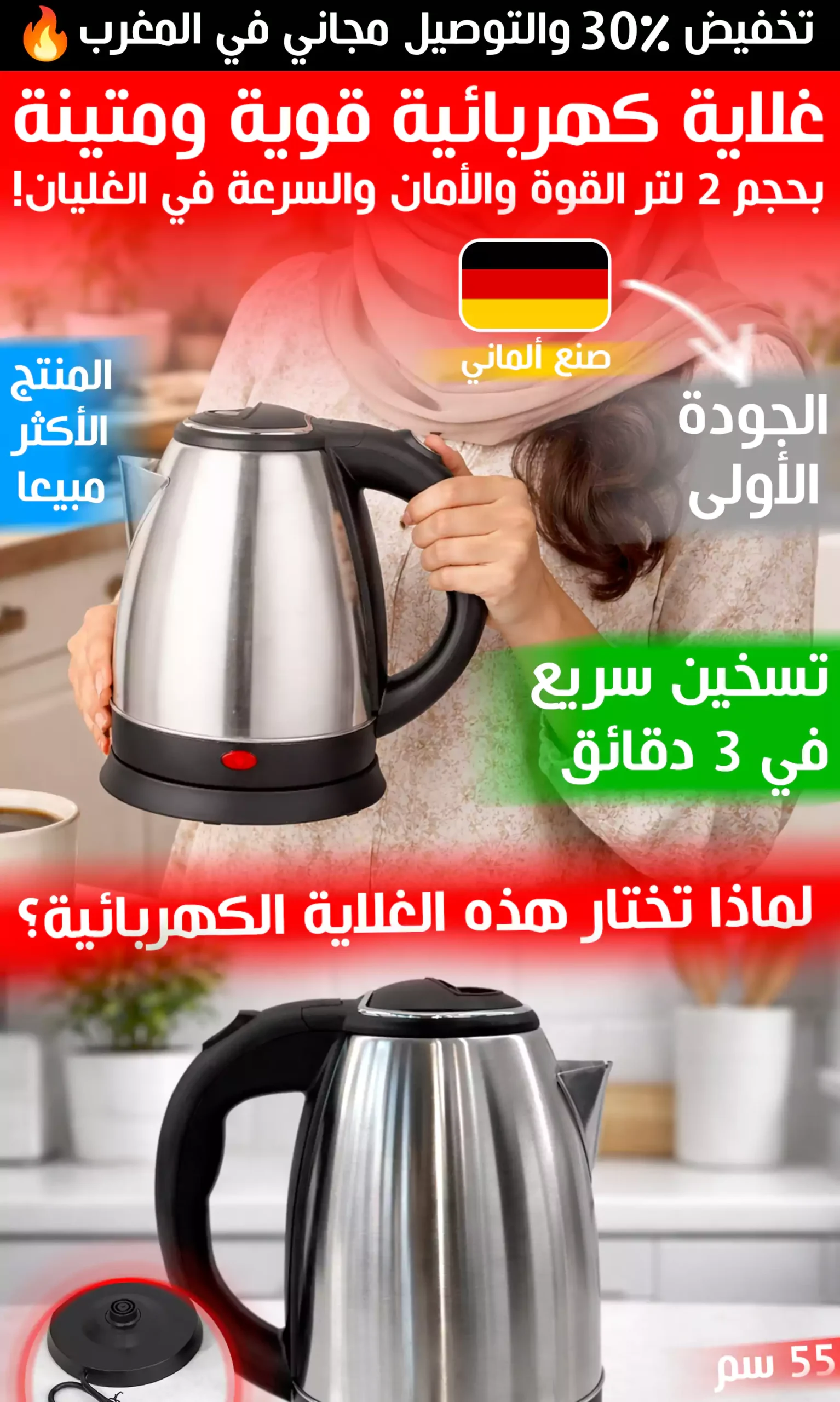 غلاية كهربائية قوية ومتينة بحجم 2 لتر